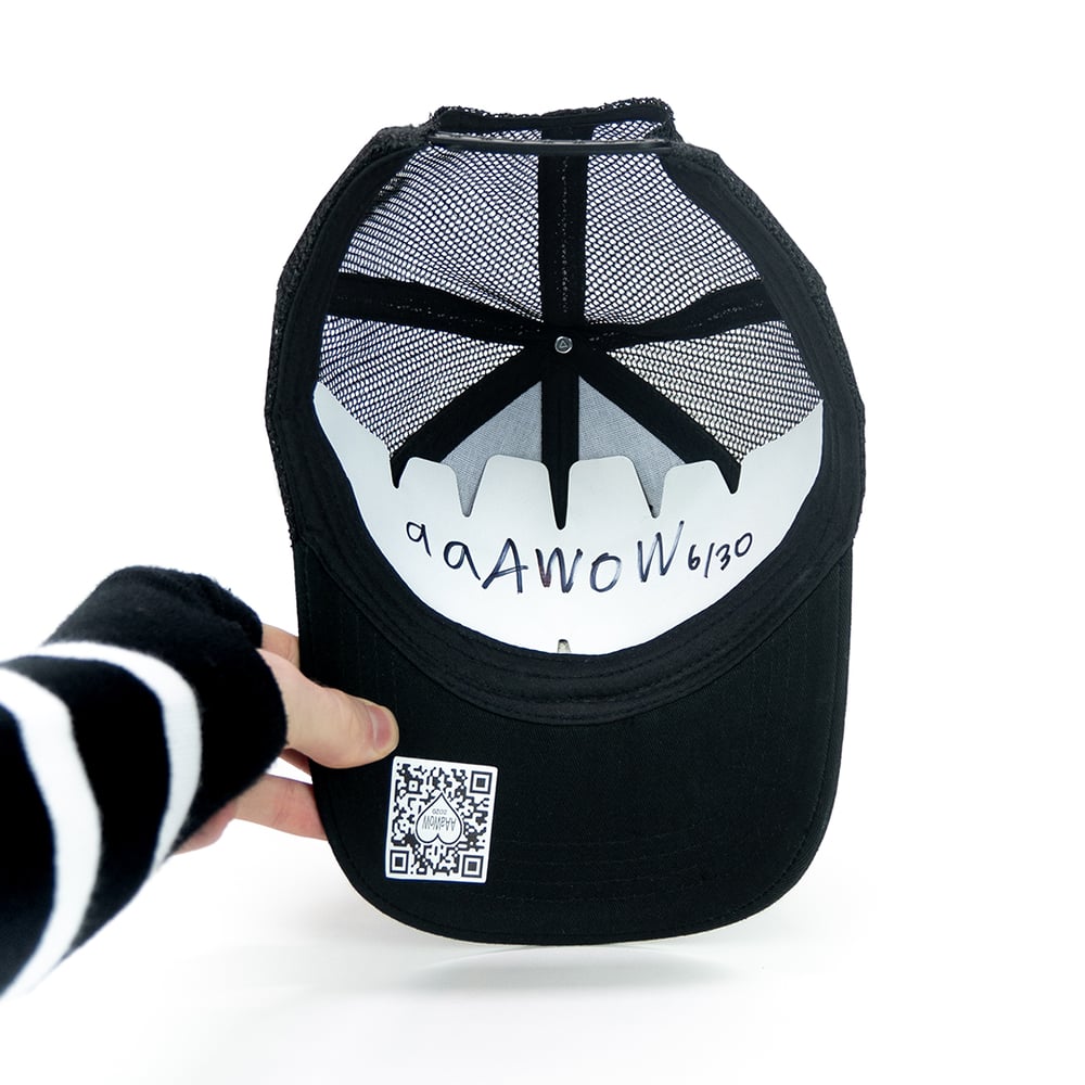 Only 30 Made. Black snapback trucker hat with a patch on the front that reads "AAaWoW AttackAnxietyAndWhatnotOrWhatever" in black htv. Comes with white Attack Anxiety Button on the side. Cardboard insert is hand marked and numbered.