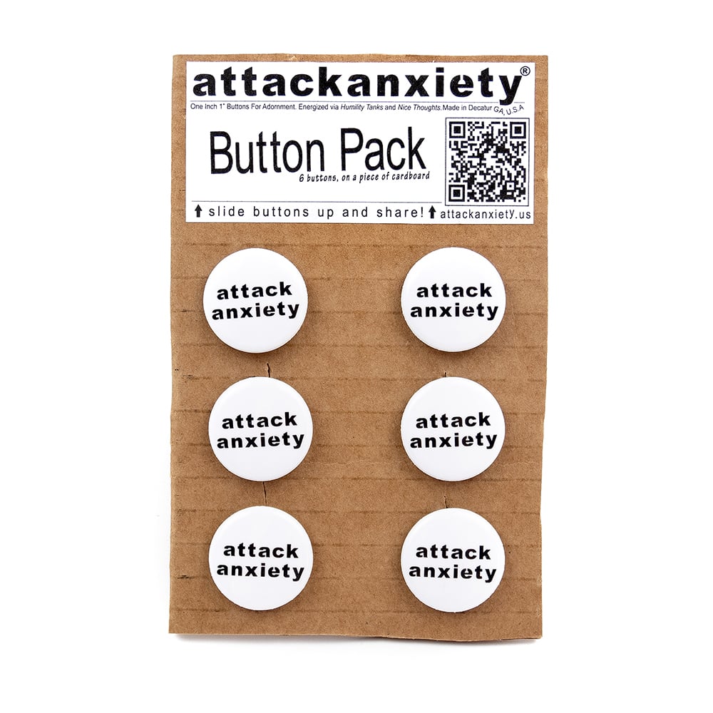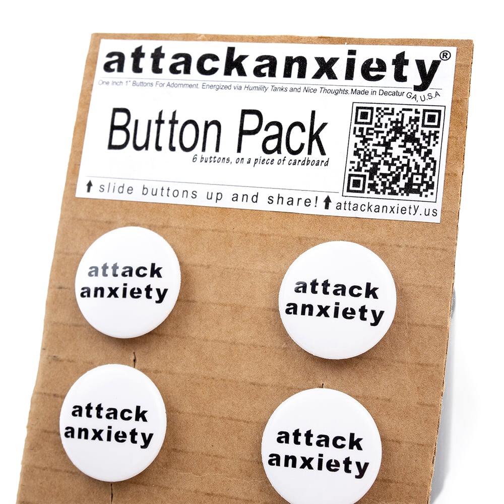 Pack of Six count em Six (6) Buttons that are 1" (One Inch) in diameter. They're white, with the black attack anxiety logo. The back is metal, and has a sharp pointy end. They say something around the edge but I can't really tell what it is exactly. And they're on a piece of cardboard, just slide them up to remove them.