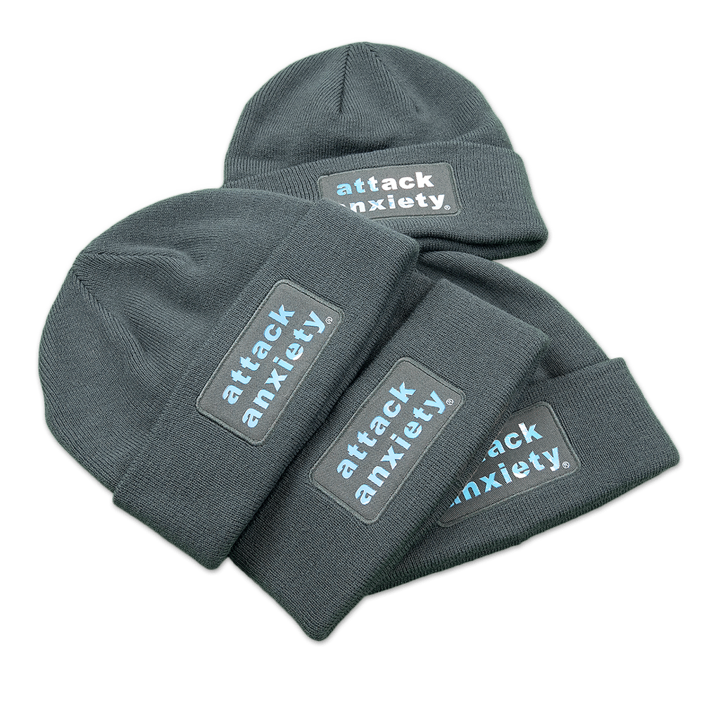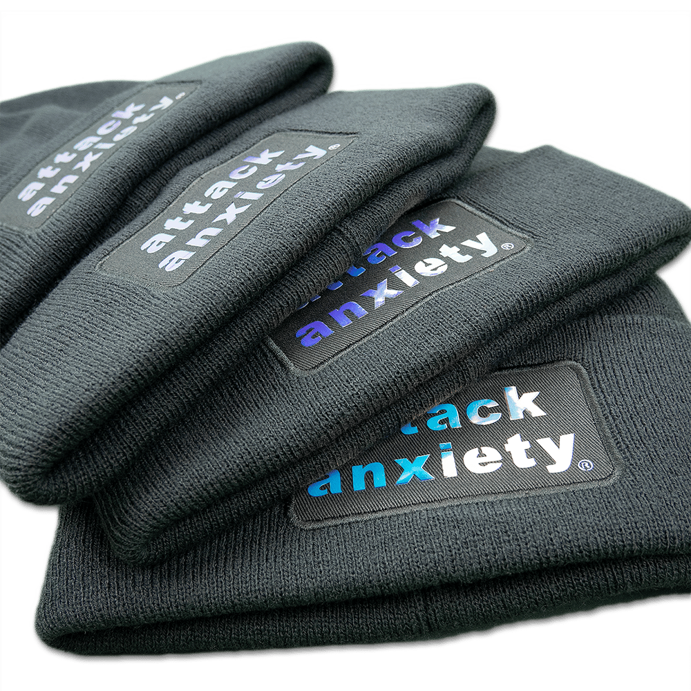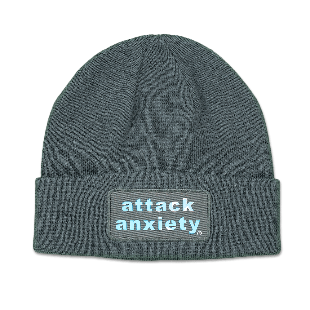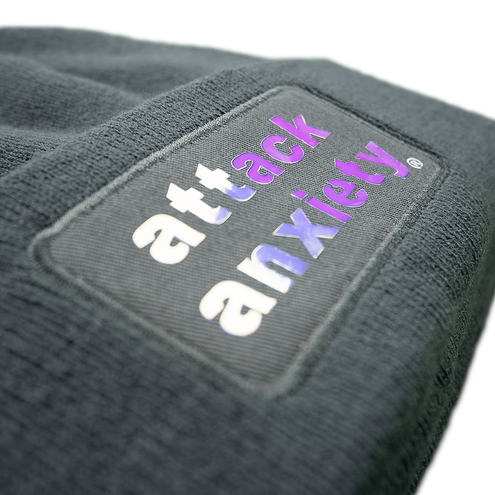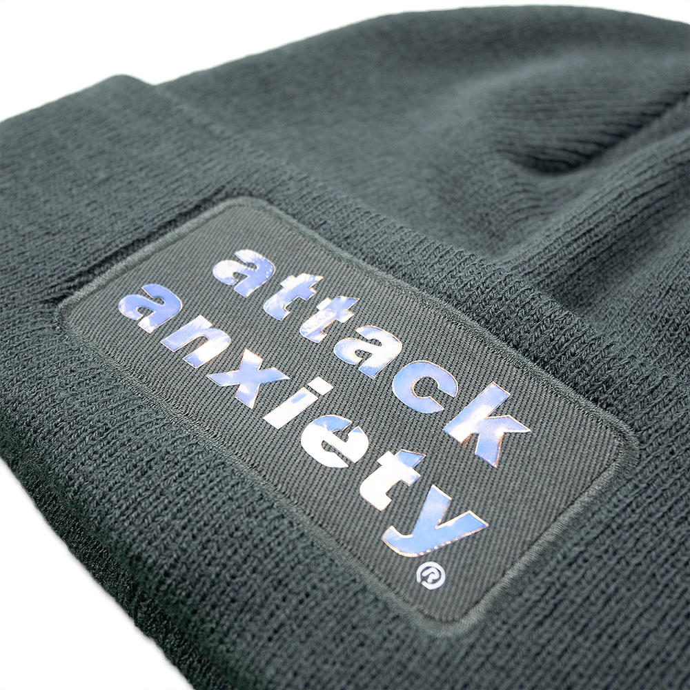 White and iridescent HTV on double layer 100% acrylic knit beanie. 8" top to bottom. Graphic changes color depending on the angle at which you view it. Shiny, mirror-like, mostly blue, purple, green, yellow. The iridescent layer may start to peel off from the white text after a long time. More likely with washing. So keep it nasty and don't pick at it.
